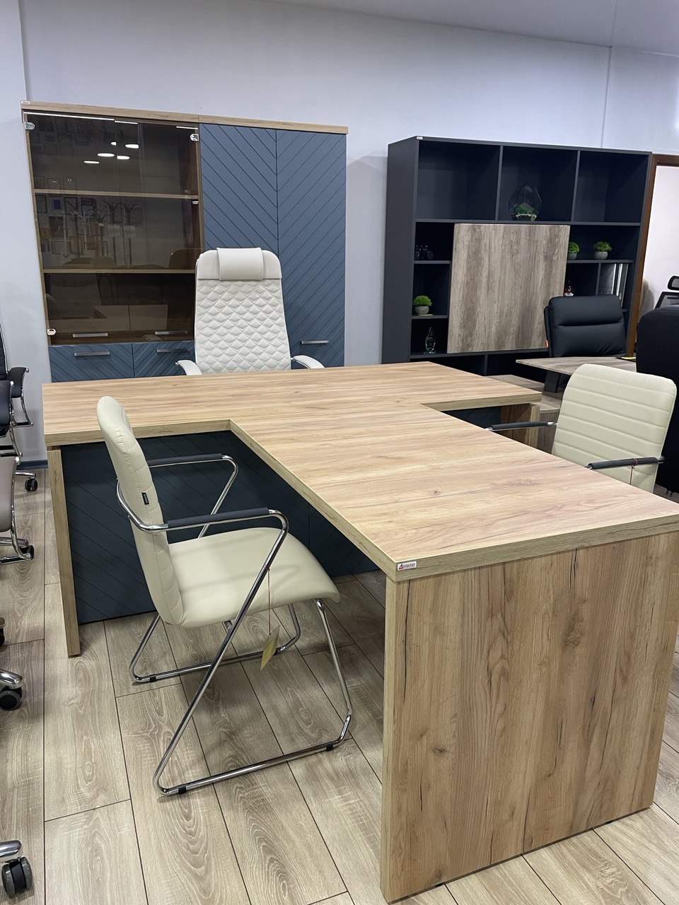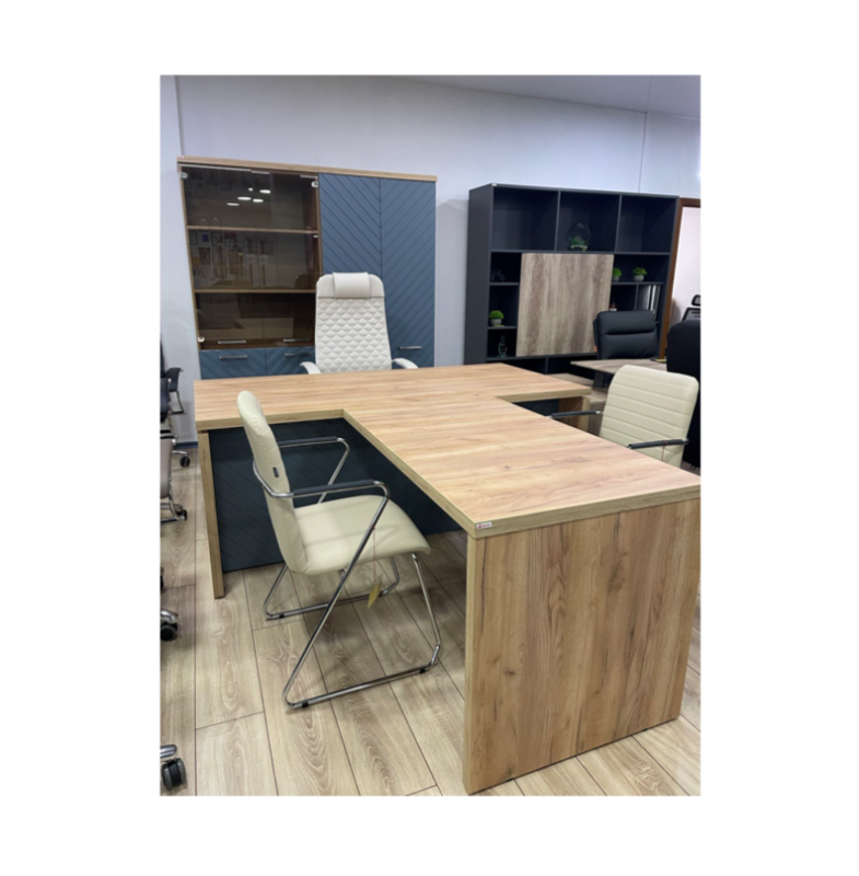 Кабинет, сочетающий в себе эффектную и нестандартную фрезеровку, древесные декоры и самые современные оттенки эмали.
