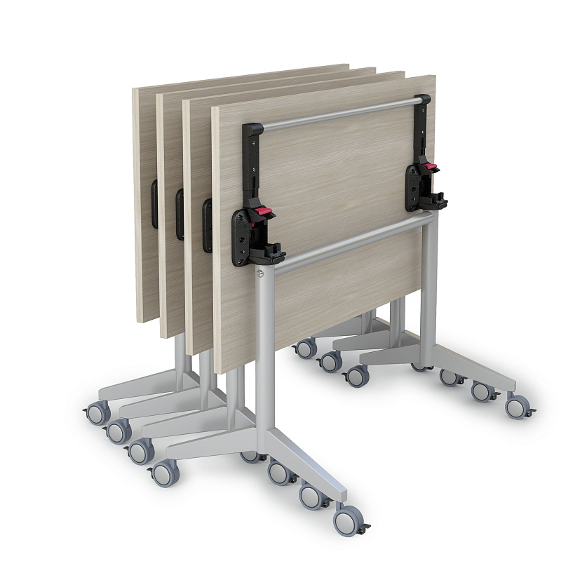 Y-образные металлические опоры, со складной столешницей. Все колёсные опоры оснащены стопорным механизмом. Механизм трансформации/складывания стола позволяет легко, одной рукой зафиксировать столешницу в горизонтальном рабочем положении или вертикальном положении для компактного хранения и транспортировки.