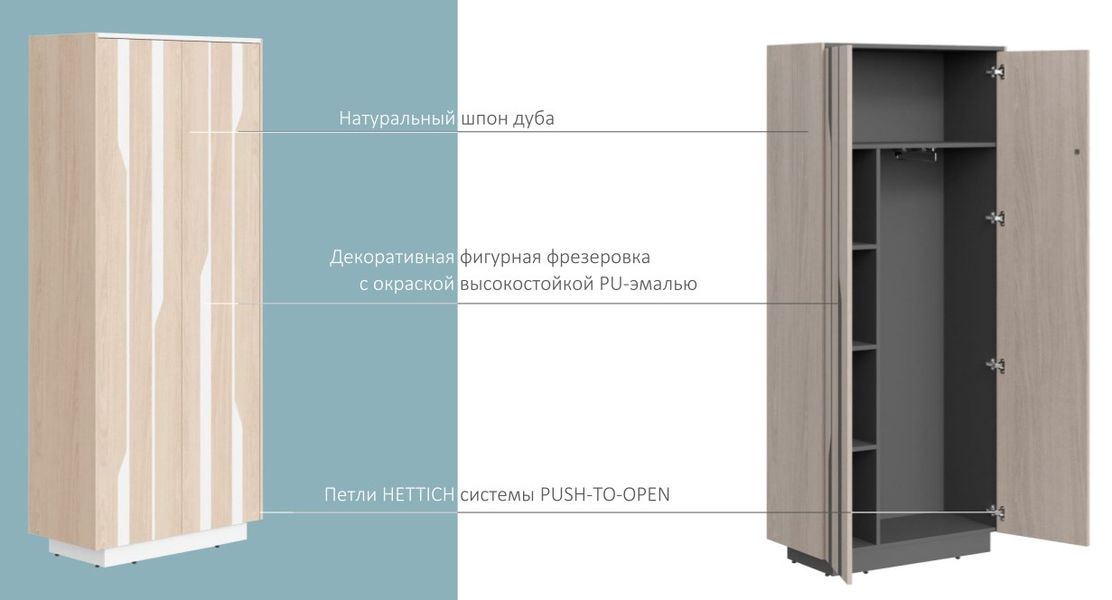 Фасады: МДФ 19 мм, облицованная натуральным шпоном дуба, с декоративной фрезеровкой. Фрезерованная часть